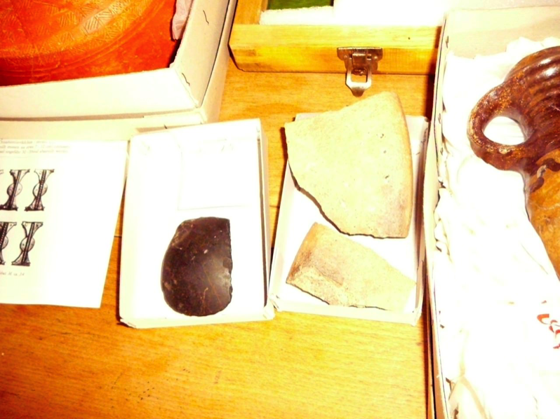 Links steinzeitliches Beil, rechts zwei Scherben keltischer Gefäße